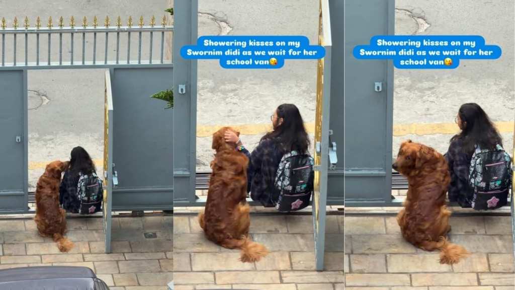 The video starts from an upstairs view, looking down toward the open gate of the house. Right there on the ground sit two little waiting partners: Peanut, the fluffy Golden Retriever, pressed close beside his sister. She’s sitting quietly while waiting for the school van. Peanut, though, has a slightly different job. He leans in and starts planting gentle kisses on her face while she accepts them like it’s the most normal thing ever.