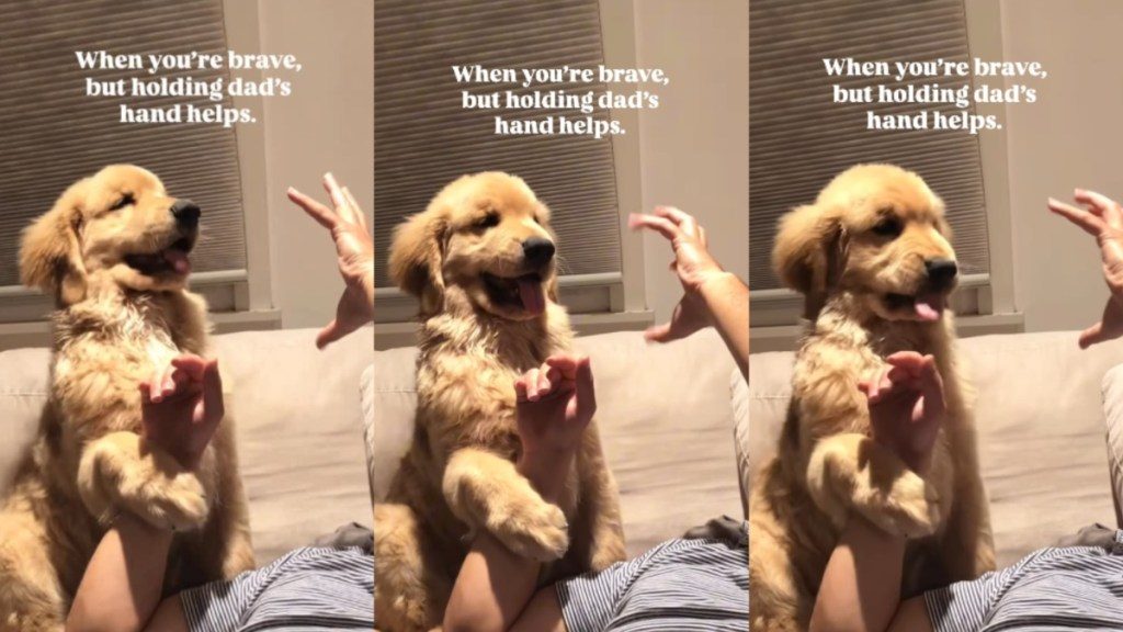 Video shows Golden Retriever puppy putting on a brave face, but let go of dad’s hand